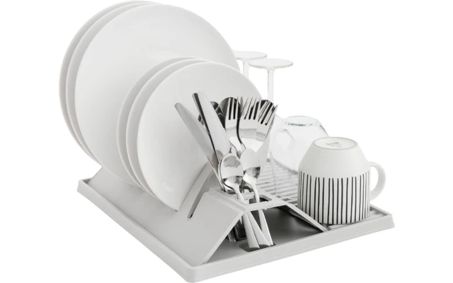 Dieser flach zusammenfaltbare Geschirrabtropfer eignet sich hervorragend für den Abwasch unterwegs.