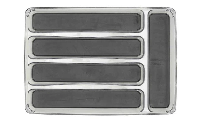 Der clevere Besteckkasten bringt Funktionalität in Küche oder Esszimmer. Im modernen Design aus hochwertigem, grau-transparentem Kunststoff gefertigt passt der Korb in jede handelsübliche Schublade. Die fünf separaten Besteckfächer ermöglichen die übersichtliche, getrennte Aufbewahrung von Messern, Gabeln, Löffeln, Teelöffeln oder Küchenmessern. Besonders praktisch: alle Fächer sind rutschfest. So ist das Besteck stets vorsortiert und griffbereit verfügbar.