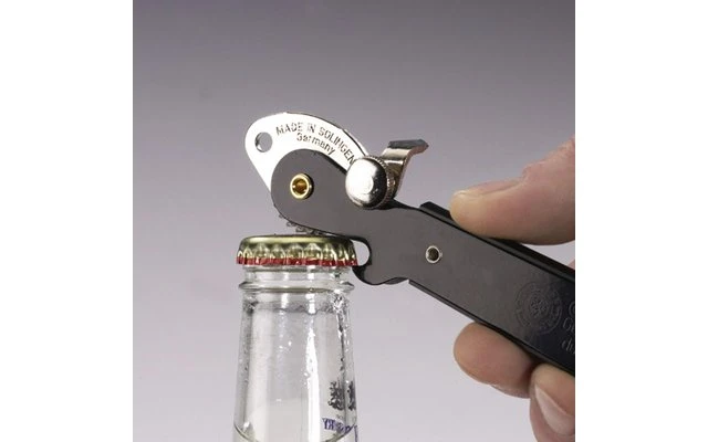 Praktischer Hebel-Dosenöffner zum Öffnen von runden und eckigen Konservendosen, inkl. Kapselheber zum Öffnen von Flaschen mit Kronkorken.